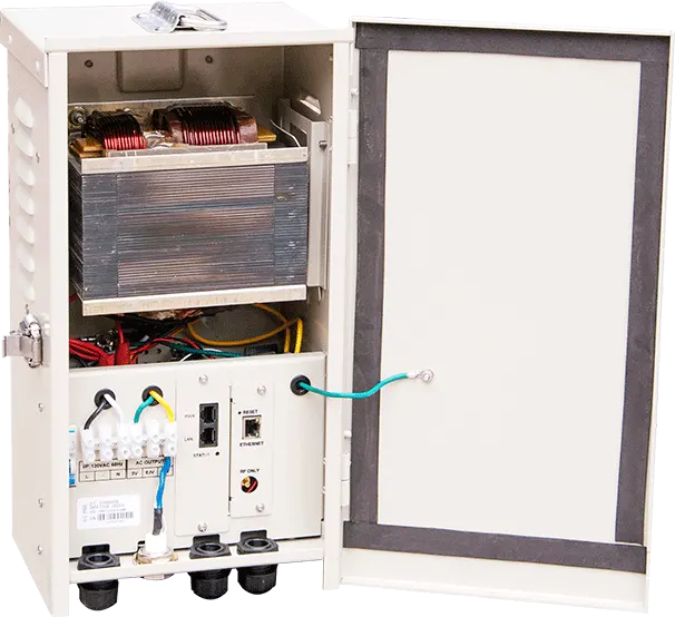 HighlightsFerro-resonant transformer provides fully regulated, clean and reliable AC outputCurrent-limited output and short-circuit protectionMCU-controlled intelligent overload protectionQuasi-square wave AC outputPower over Ethernet (PoE) module as standard featurePowder coated aluminum housing for outdoor applications Service receptacle (NEMA 5-15R or customized)Optional DOCSIS/EuroDOCSIS 3.0 Transponder / Cable Modem as backhaulSpecificationsModelsGD-CPT900-L120GD-CPT1350-L120GD-CPT900-WGD-CPT1350-WInputVoltage120VAC220VACVoltage Range-20% to 15%Frequency60Hz50HzPower Factor≥0.9(full load)OutputVoltage60/90VACRegulation+/-5%WaveformQuasi-squareCurrent15A / 10A22A / 15A15A / 10A22A / 15APower900VA1350VA900VA1350VAProtectionCurrent limitedShort Current150% of max. current ratingEfficiency≥90%Power-over-Ethernet (PoE)Input Voltage Range85 to 265VACInput Frequency50/60HzPower Factor50VDC @ 1AOutput Voltage1%Ripple2%Line Regulation75KHzSwitching Frequency85%EfficiencyNoLAN Activity IndicatorYesGigabit LAN PortNoRemote ResetNoReset ButtonNoDate In / PoE InterfaceRJ45MechanicalInput Connection(s)Terminal blockOutput Connection(s)5/8" femaleLED DisplayPower supply status, transponder statusEnclosure Materialpowder coated aluminumDimensions216 x 394 x 188mm / 8.5” x 15.5” x 7.4”EnvironmentalOperating Temperature-40°C to 55°C / -40°F to 131°FHumidity0 to 95% non-condensingMore voltage configurations may be available. Please download the datasheet or contact us directly for more details.Due to continuing improvements, the product is subject to change without prior notice.