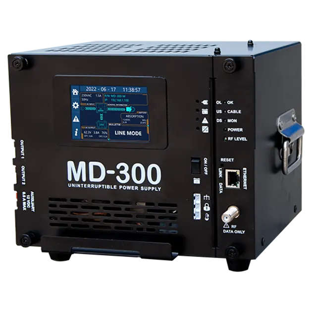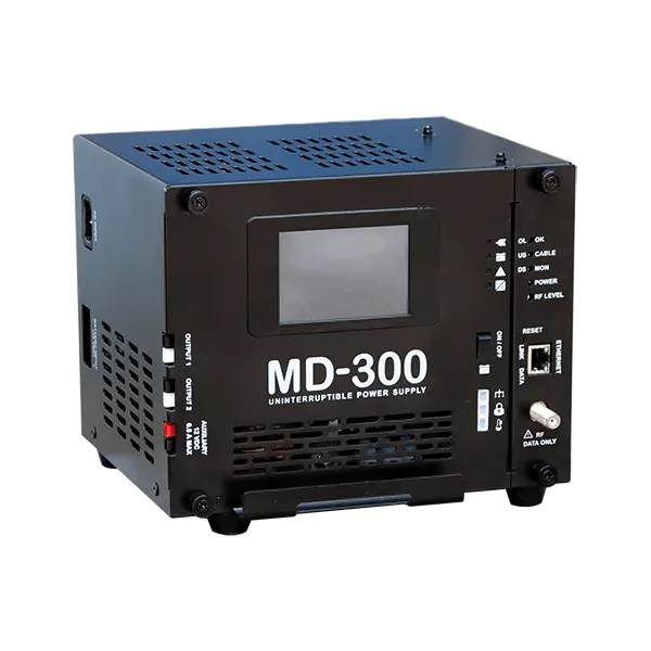 HighlightsCompact, lightweight and ideal for RFoG MDU applicationsLine interactive technologyOne single battery (12VDC) configuration reducing costs of ownership and maintenanceFriendly and interactive 3.5” color touchscreen displayMicro-processor regulated sine-wave AC outputIntelligent battery management system with temperature compensationLightning arrester integratedReliable protections against input, output and short-circuitEasily accessible front panel connections and hot swappable inverter modulesField-selectable output voltageOptional DOCSIS / EuroDOCSIS transponders for status monitoringSpecificationsModelsMD-300-WMD-300-LMD-300-L120InputVoltage220VAC120VACVoltage Range± 15%Frequency50Hz60Hz60HzPower Factor≥ 0.9 at full loadOutputVoltage60VAC60V/90V, field-selectableRegulation+/-5%WaveformSine waveCurrent5APower300VAProtectionCurrent limitedShort CurrentProgrammable, 125% max.Efficiency≥90%Transfer characteristic4msBattery & ChargerBattery TypeVRLA or LithiumCharger Current6-10ACharging Time8 hours typical to 90% capacityMechanicalInput Connection(s)IEC320/C14Output Connection(s)Anderson connectorsFinishBlack powder coatingDimensions234 x 197 x 220mm / 9.2” x 7.8” x 8.7”EnvironmentalOperating Temperature-40°C - 55°CHumidity0 ~ 95% non-condensingMore voltage configurations may be available. Please download the datasheet or contact us directly for more details.Due to continuing improvements, the product is subject to change without prior notice.Related ProductsMD Standby Power Supply (Outdoor)All-new MD Outdoor UPSPME Pole Mount Outdoor EnclosurePME-1, specially designed for MD-300 Power Supply